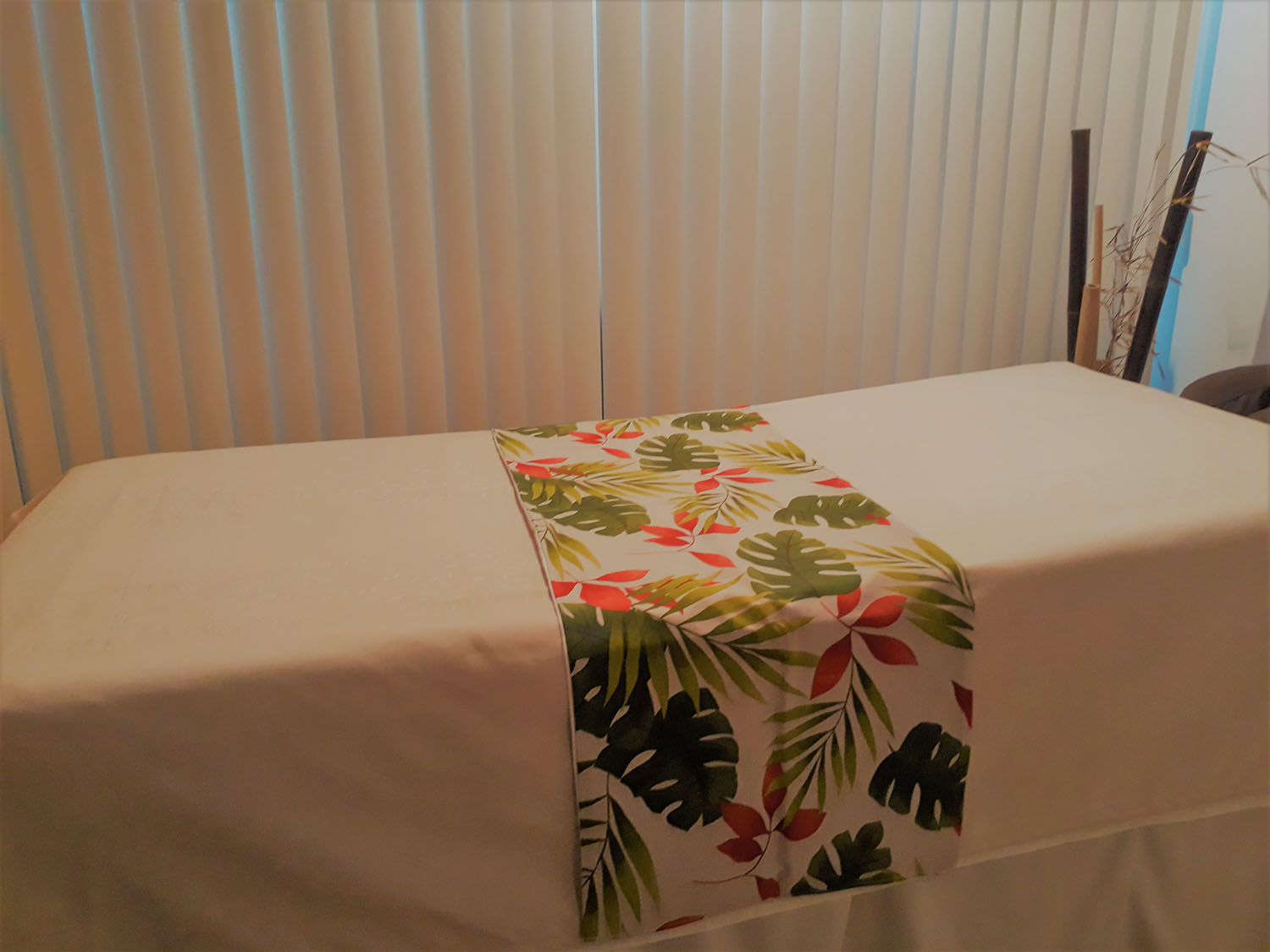 Camino para camilla, reversible, liso perla y estampado hojas rojas