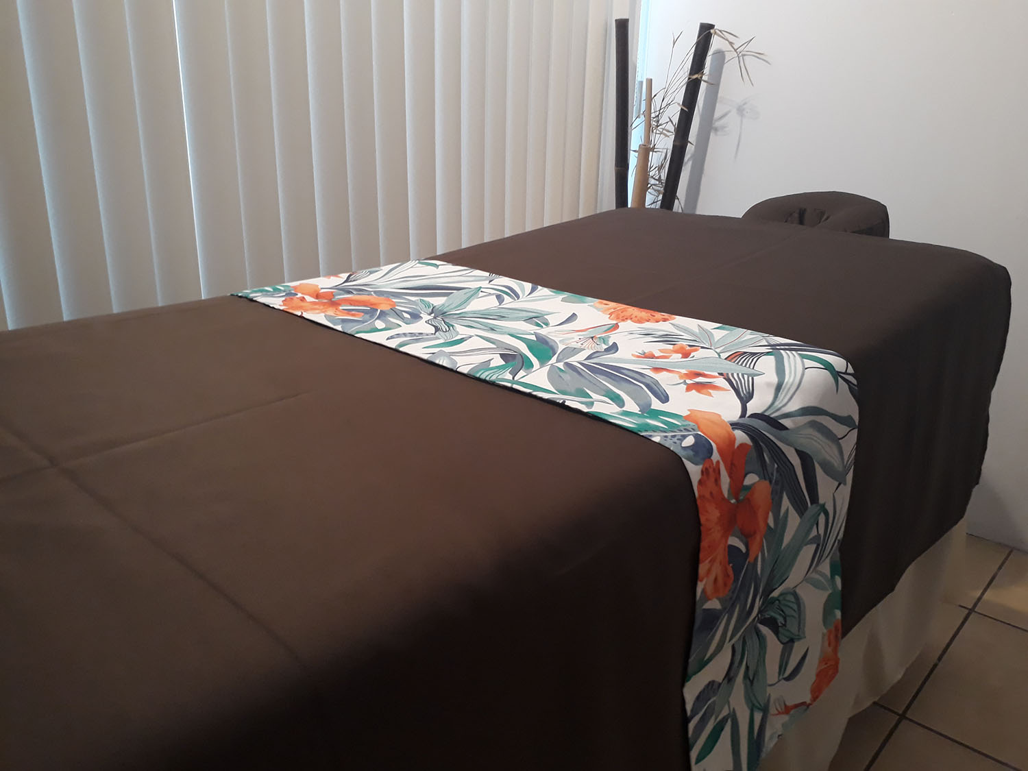 Camino para camilla, reversible, liso perla, flores y hojas turquesa.