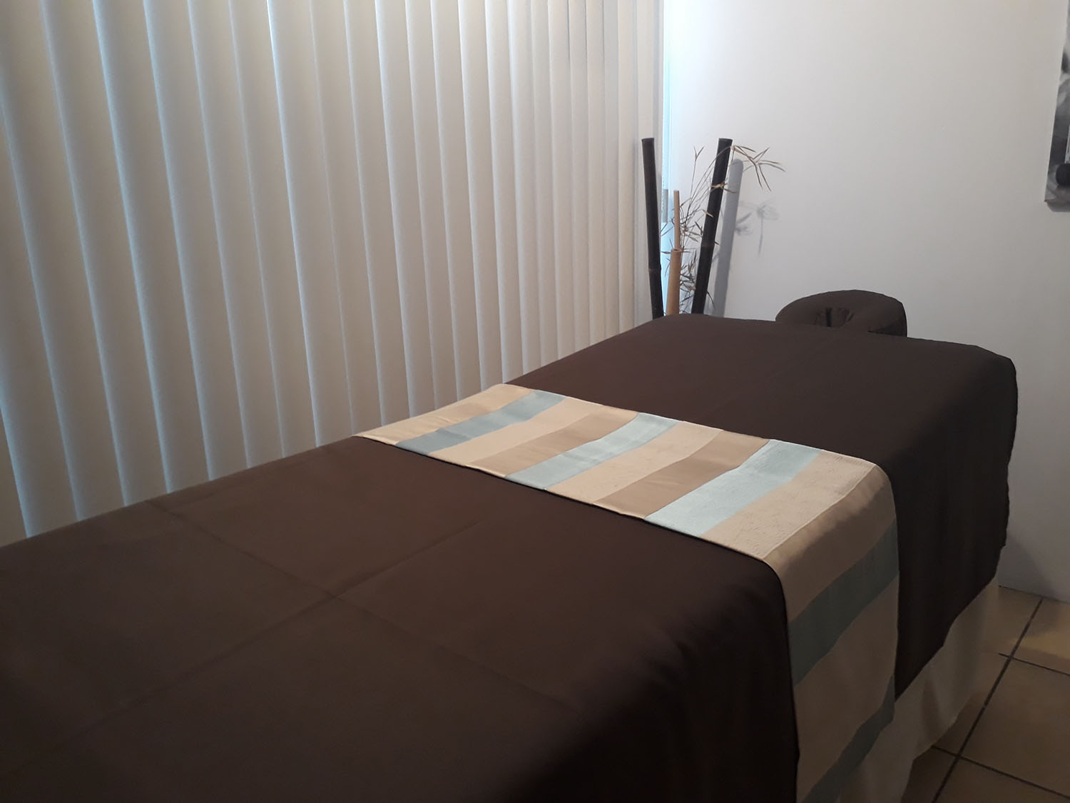 Camino para camilla, estampado rayas color arena y turquesa.