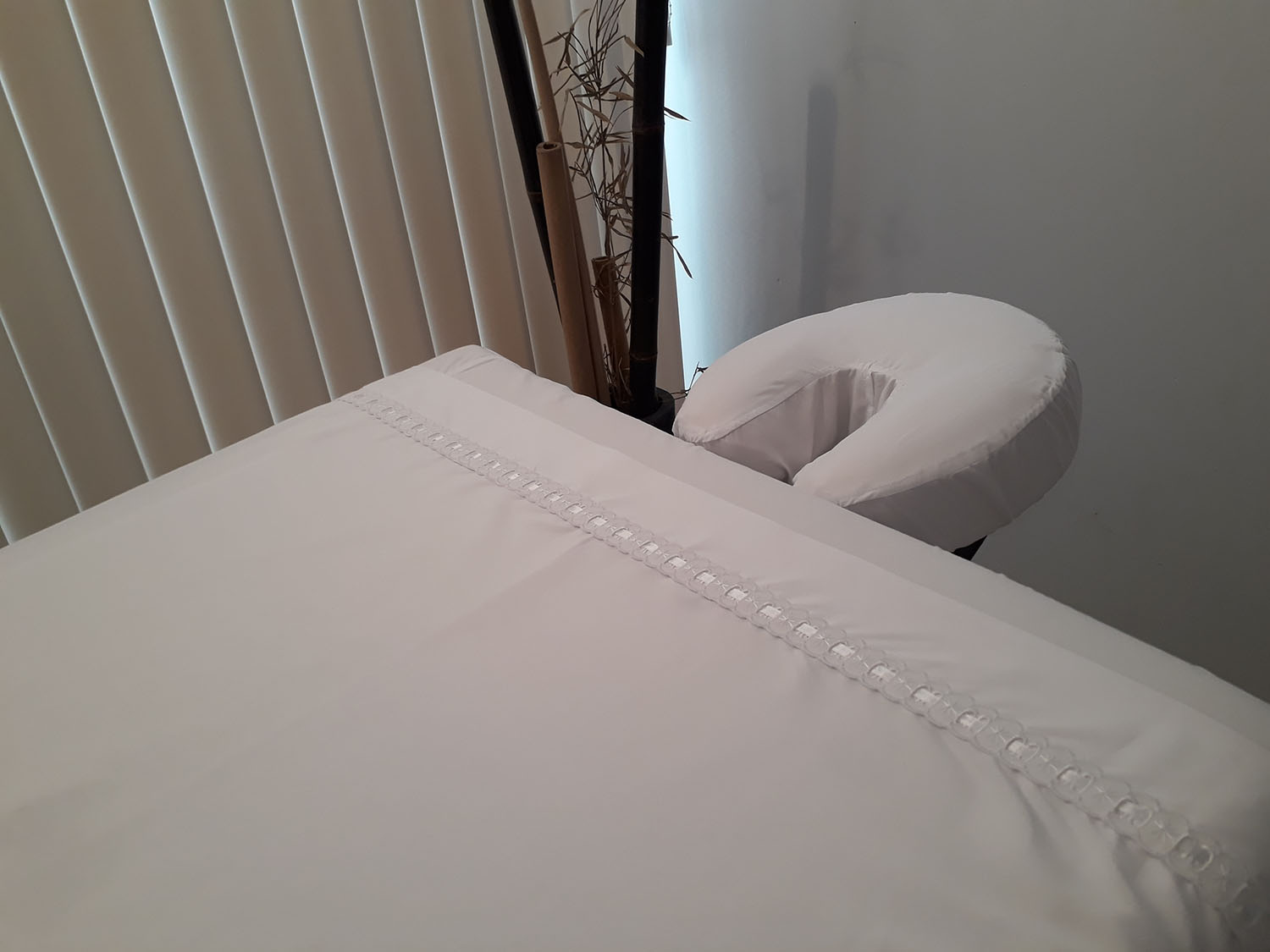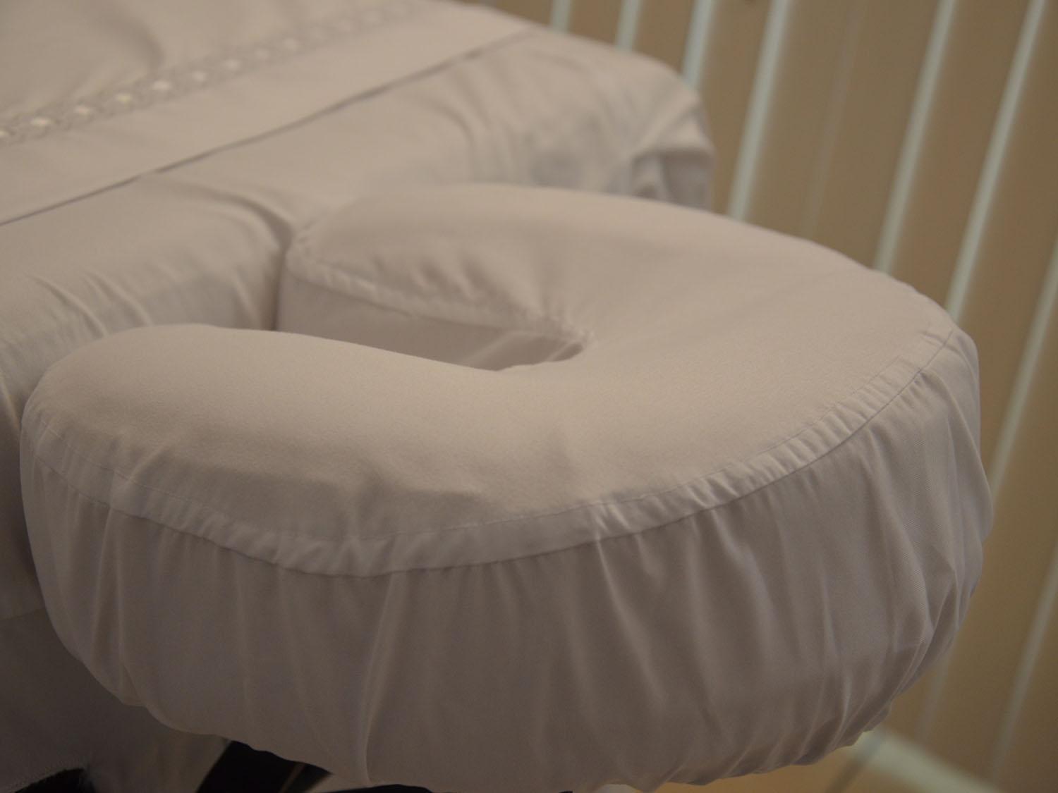 Cobertor para cabecera de camilla tipo herradura tela poliéster y algodón, color blanco o beige